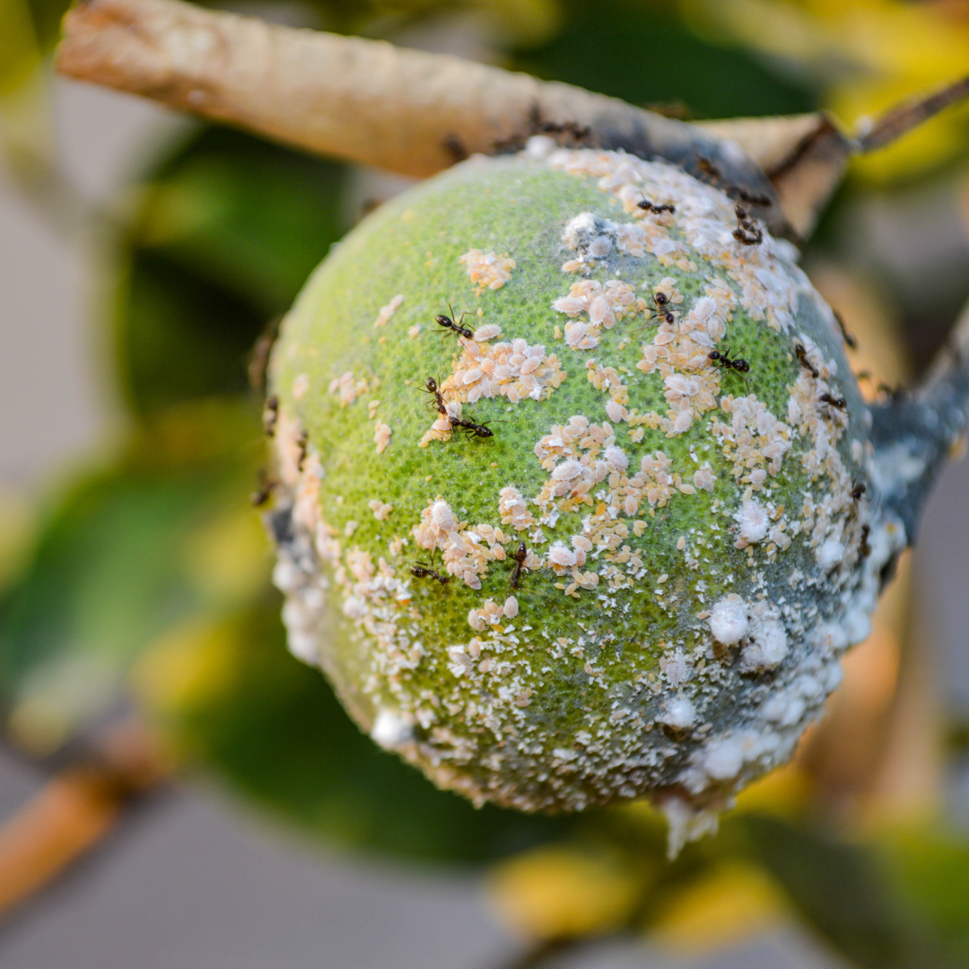 - Mealybugs excrete a sweet, sticky substance that attracts ants. Over time, this excretion can lead to the buildup of dust and bacteria on leaves and fruit surfaces, further harming the plant.
