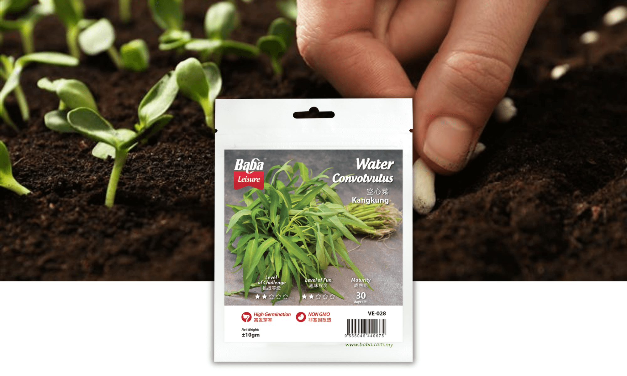 Fill up planter box with Baba Yasa-I soil or Baba Peat Moss. Draw lines on the soil, and each line maintain 100-150mm (or purlicue) distance. Spread the seeds on top of the soil, then cover with a thin layer of soil.