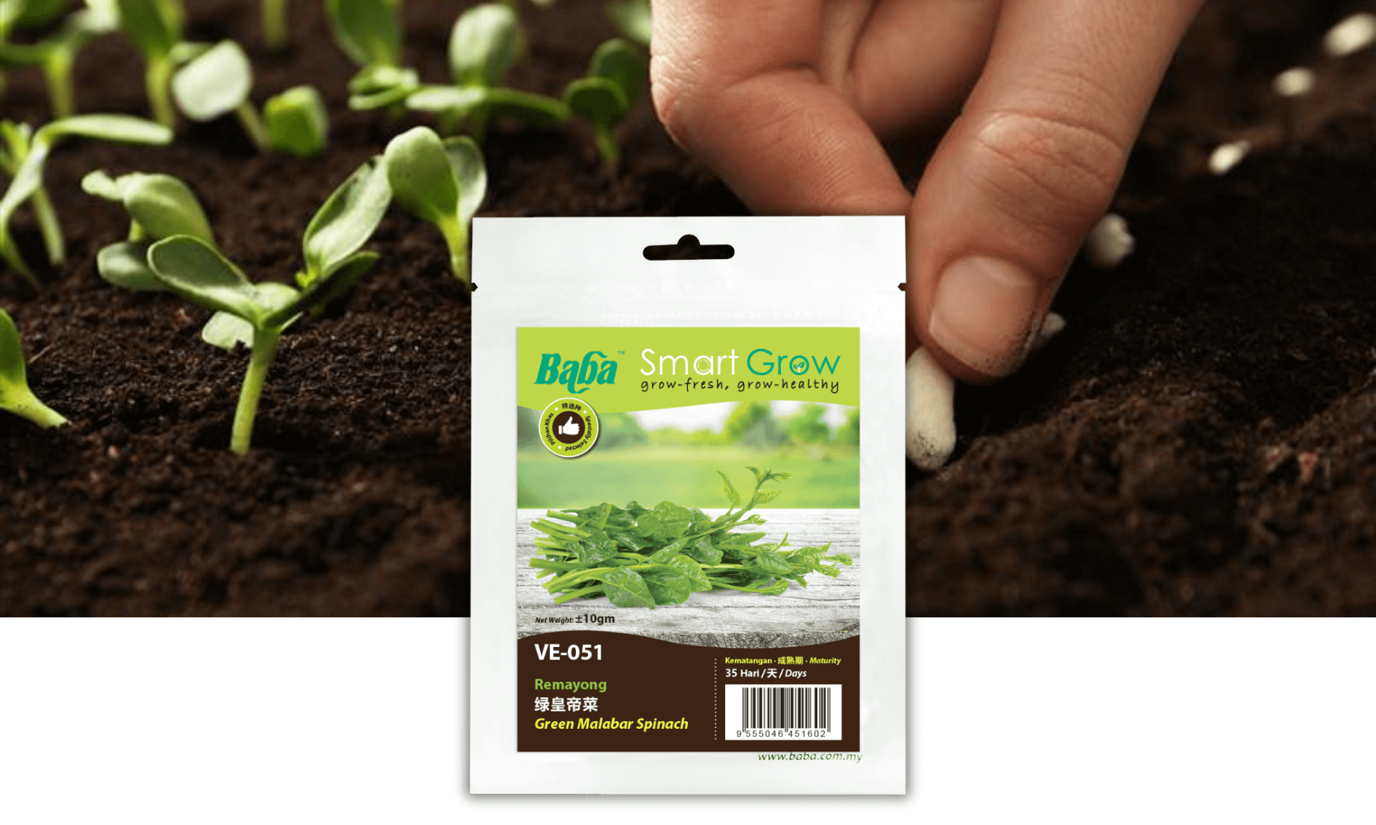 Prepare Baba seedling soil and seedling pots. Fill up the seedling pots with Baba seedling soil, use finger gently make a small hole, put in 2-3 seeds and cover with a thin layer of soil.