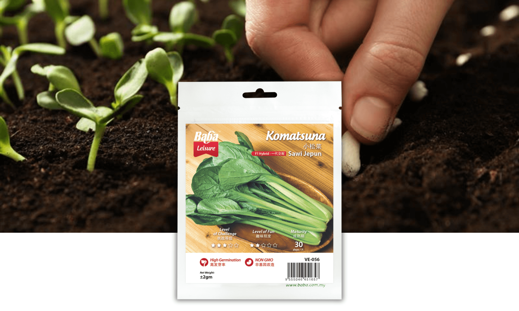 Prepare Baba seedling soil and seedling pots. Fill up the seedling pots with Baba seedling soil, use finger gently make a small hole, put in 2-3 seeds and cover with a thin layer of soil.